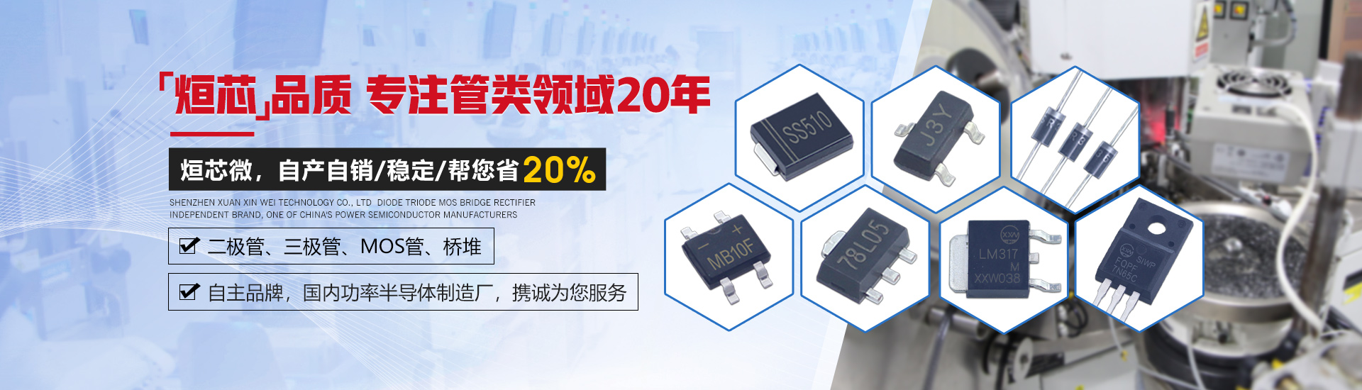 深圳市烜芯微科技有限公司是一家集研發(fā)、生產(chǎn)、銷售于一體,專注于二極管、三極管,MOS管、橋堆等功率半導(dǎo)體領(lǐng)域發(fā)展的企業(yè)。采用國(guó)際領(lǐng)先的GPP芯片生產(chǎn)工藝及一心多Die高精密制造工藝,擁有功率半導(dǎo)體器件工程實(shí)驗(yàn)室,全自動(dòng)高精密生產(chǎn)設(shè)備,產(chǎn)品層層把控,全程可追溯,保障了每只產(chǎn)品的卓越品質(zhì)。 產(chǎn)品封裝包括SMA,SMAF,SMB,SMBF,SMC,SOD-123,SOD-123FL,SOD-323,SOD-323FL,SOD-523,SOD-723,SOT-23,SOT-89,SOT23-3L,SOT23-5L,SOT23-6L,SOT-223,SOT-523,SOT-723,DO-41,DO-15,DO-27,DO-35,R-1,R-6,LL-34,LL-41,TO-277,TO-92,TO-92S,TO-92L,TO-126,TO-251,TO-252,TO-262,TO-263,TO-220,TO-220F,TO-247,TO-3P,TO-264,MBS,MBF,MBM,ABS,UMB,UMSB,DB,DBS,D3K,KBP,GBP,GBU,GBL,GBJ,KBL,KBU,KBJ,KBPC,KBPC6,KBPC8,KBPC-W,DNF,TSSOP-8,TSSOP-16,SOP-4,SOP-6,SOP-8,SOP-10,SOP-14,SOP-16,DIP-4,DIP-6,DIP-8,DIP-10,DIP-14,DIP-16,月產(chǎn)各封裝達(dá)6億只。 公司通過了ISO14001環(huán)境管理體系認(rèn)證,產(chǎn)品均獲得了ISO9001質(zhì)量體系認(rèn)證、UL、SGS等認(rèn)證,符合歐盟最新RoHs指令。擁有和致力于烜芯微/XXW自主品牌產(chǎn)品的推廣,提供技術(shù)支持,選型替換,cost down方案及擁有專業(yè)的生產(chǎn)管理團(tuán)隊(duì)和銷售團(tuán)隊(duì),保證了供貨穩(wěn)定及售前選型服務(wù)等問題。 公司產(chǎn)品廣泛應(yīng)用于開關(guān)電源、適配器、逆變器、控制器、汽車電子、家用電器、通訊設(shè)備、無線充、鋰電池保護(hù)板、驅(qū)動(dòng)電機(jī)、安防警報(bào)、太陽(yáng)能光伏產(chǎn)業(yè)等多個(gè)領(lǐng)域。取得了國(guó)內(nèi)外眾多品牌大廠的認(rèn)可與合作,我們將堅(jiān)持奉行“烜芯品質(zhì),誠(chéng)信經(jīng)營(yíng),合作共贏”為公司經(jīng)營(yíng)理念!竭誠(chéng)為新老客戶提供優(yōu)質(zhì)的產(chǎn)品及服務(wù)。