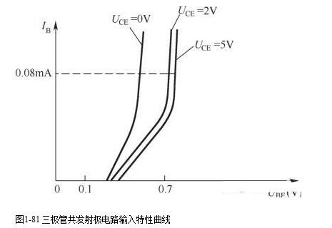 三極管輸入特性曲線,三極管輸出特性曲線介紹圖1-81所示是某型號(hào)三極管共發(fā)射極電路輸入特性曲線。圖中,x軸為發(fā)射結(jié)的正向偏置電壓大小,對(duì)